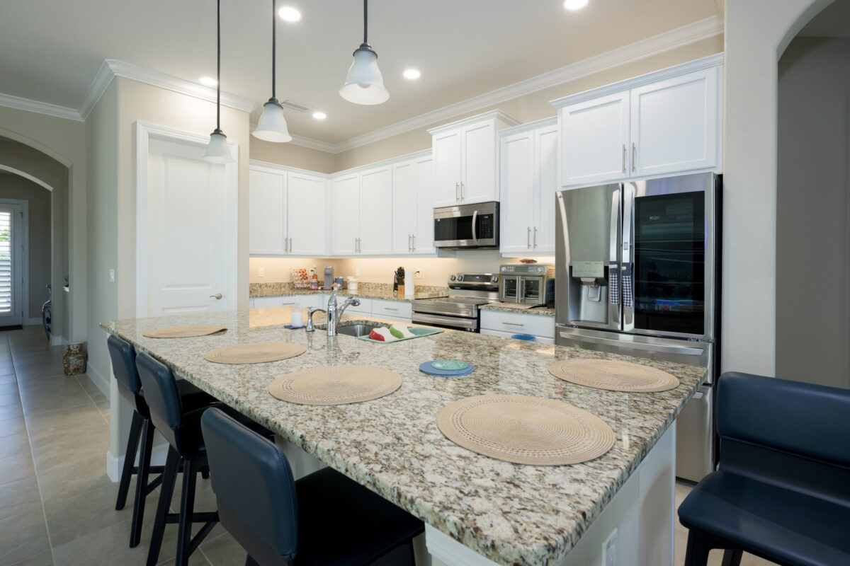 This kitchen cabinet painting project was completed in a Margaritaville home in Daytona Beach with a traditional design and builder-grade wood cabinets. The cabinets were painted in Benjamin Moore Swiss Coffee, creating a bright, timeless look that complements the home’s coastal style. The kitchen originally had tile with a transition strip, but the flooring was continued into the kitchen to create a more open and seamless flow. Shiplap was installed underneath and around the back of the island by the homeowner, and we painted it to finish the look. The shiplap wraps around the back of the island and extends around the corner where the chairs are located, adding texture and visual interest to the space.